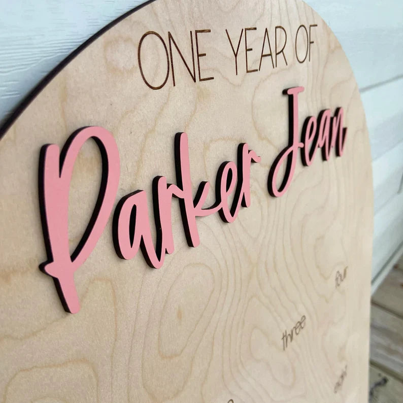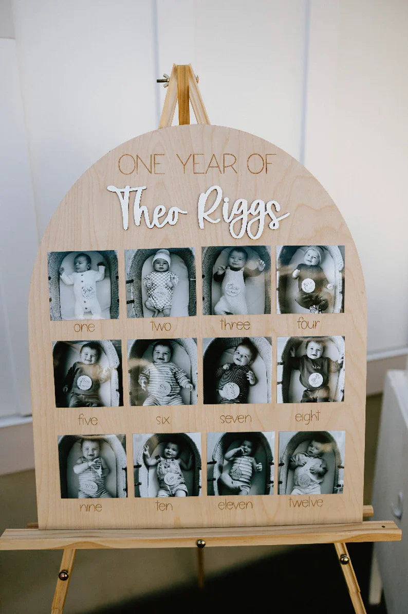 Celebrate your baby's first year with our custom wooden 12-month photo display board, thoughtfully designed to showcase their growth month by month. Crafted from high-quality wood with a smooth natural finish, this milestone board is laser-engraved with “One Year Of” and topped with a beautiful 3D name in your color of choice.
