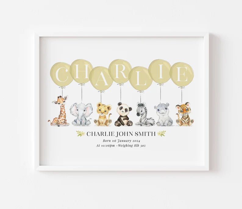 Celebrate your little one's arrival with this adorable personalized nursery print! Featuring a lineup of hand-painted safari animals (giraffe, elephant, lion, panda, zebra, tiger, hippo...) holding pastel balloons that spell out your baby's name, this charming artwork adds a whimsical and loving touch to any nursery wall.